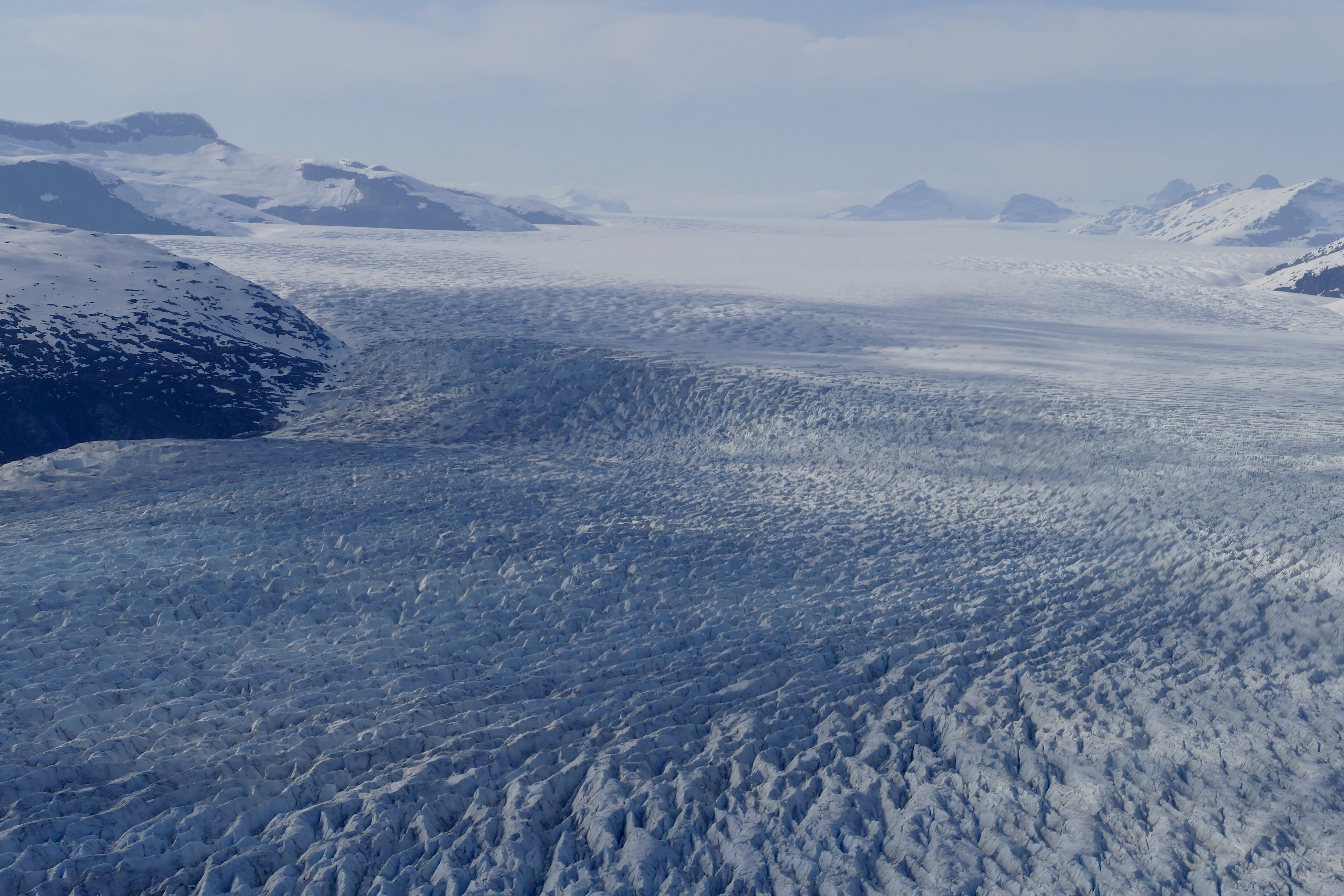 Not very many seconds earlier, we were looking down – and upstream – at an unknown number of square kilometres of this still-gigantic “river” of ice’s surface.