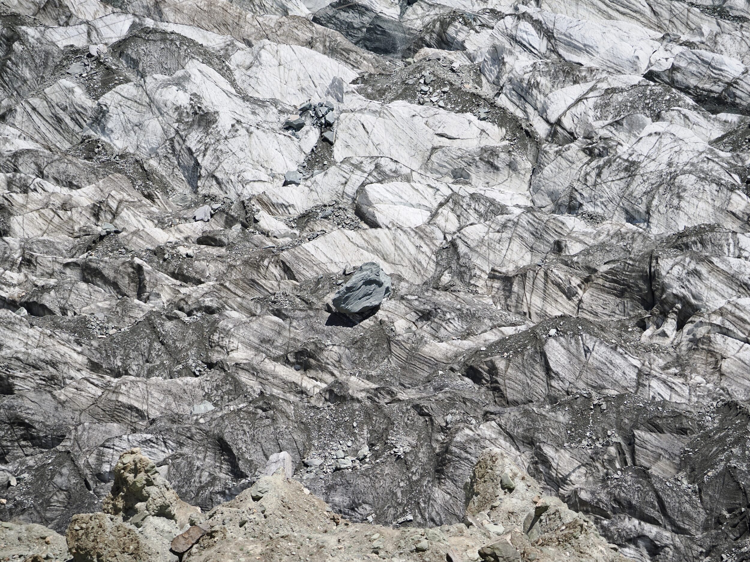 Perhaps my photo’s “hero” rock had thundered down onto the lower part of the glacier’s surface recently, via a landslip from the heights above, probably with an earthquake’s assistance.